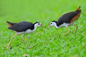 Description :The white-breasted waterhen is a waterbird widely distributed across South and Southeast Asia. They mainly eat insects (beetles), small fish, aquatic invertebrates and grains or seeds. They are dark slaty birds with a clean white face, breast and belly. They are largely crepuscular in activity and during the breeding season, just after the first rains, make loud and repetitive croaking calls.