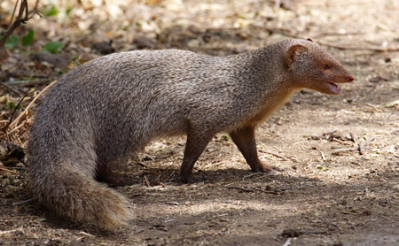 Description :The Indian grey mongoose or common grey mongoose) is a mongoose species mainly found in West Asia and on the Indian subcontinent. It lives in burrows, hedgerows and thickets, among groves of trees, and takes shelter under rocks or bushes and even in drains. They prefer to eat small animals such as birds, reptiles, fish, snakes, crabs, rodents, frogs, insects and worms. They will also supplement their diet with eggs, nuts, fruits, roots, berries and seeds.