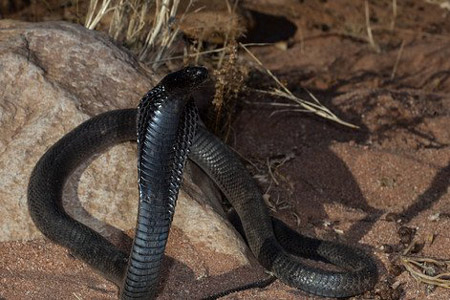 Description : Also known as black cobra, is a colour variant of Indian cobra. Melanism is a development of dark-coloured pigment melanin in the skin or scales.